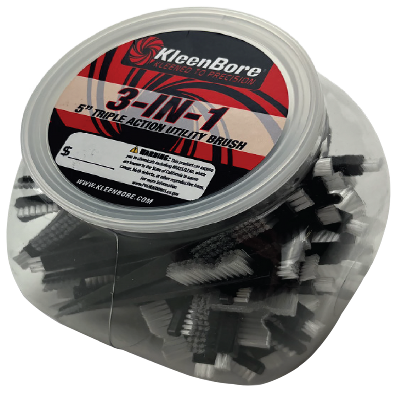 This Kleen-Bore Triple Action Utility Brush is a 5-inch nylon brush designed for general firearm cleaning and maintenance. The pack contains 50 individual brushes, making it suitable for bulk use or storage. Triple Action design provides effective cleaning action for various gun care applications.