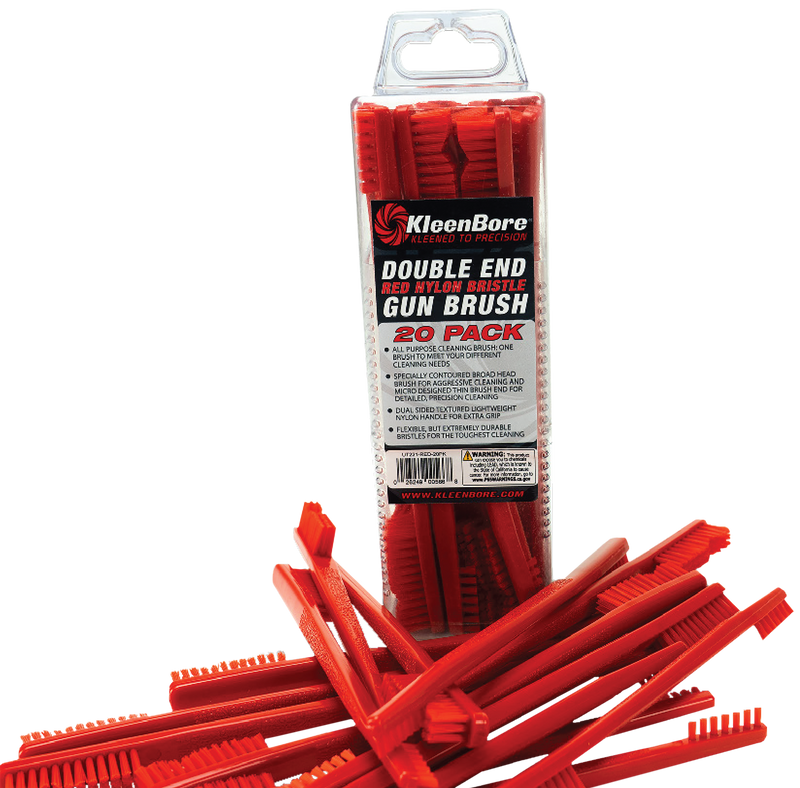 This 20-pack of double-ended nylon brushes from Kleen-Bore is designed for general firearm cleaning and maintenance. Each brush features red nylon bristles and measures 7.9 inches in length, making it suitable for various cleaning applications. The utility brush design allows for efficient cleaning of firearms and related components.