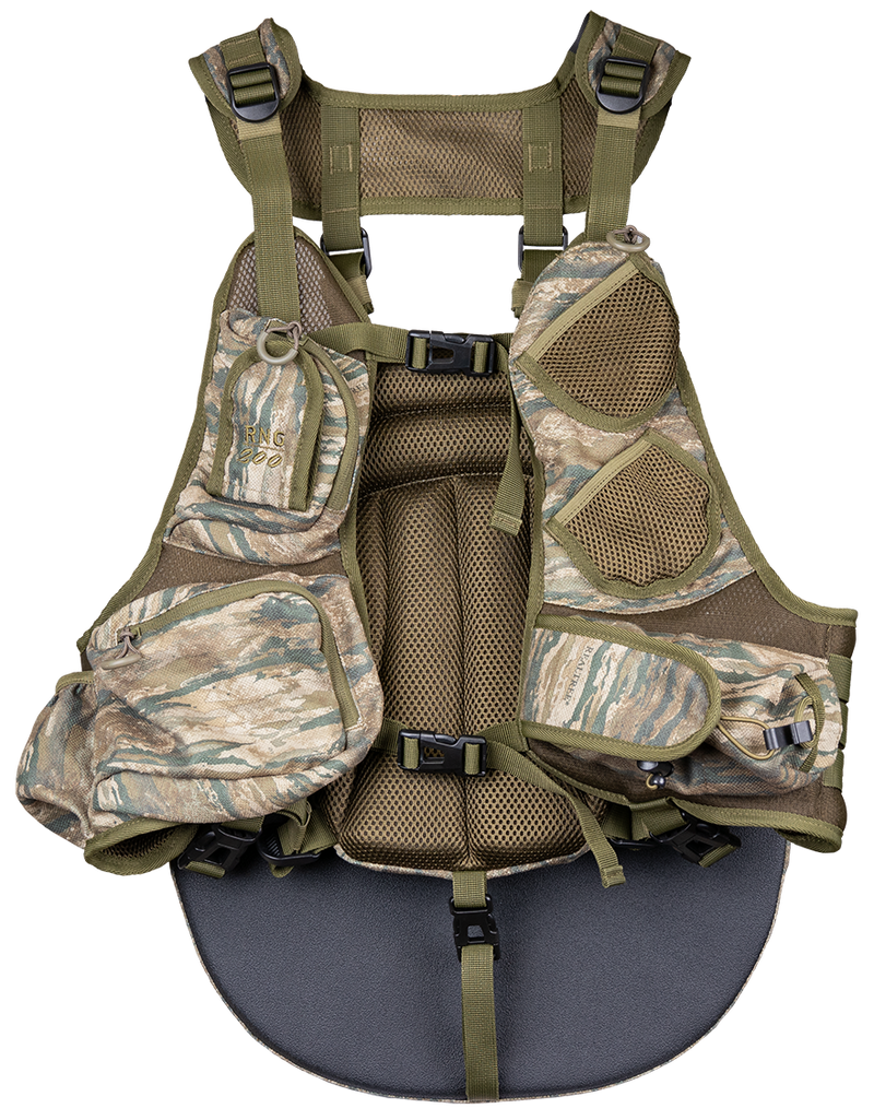 A lightweight turkey hunting vest weighing 1.5 lbs with a 10-point adjustment system designed to provide a secure fit without baggage or shifting. The vest features adjustments at the shoulders, chest, belly, and lumbar regions to keep gear in place while moving through brush. Available in Realtree camouflage pattern in one size fits most.