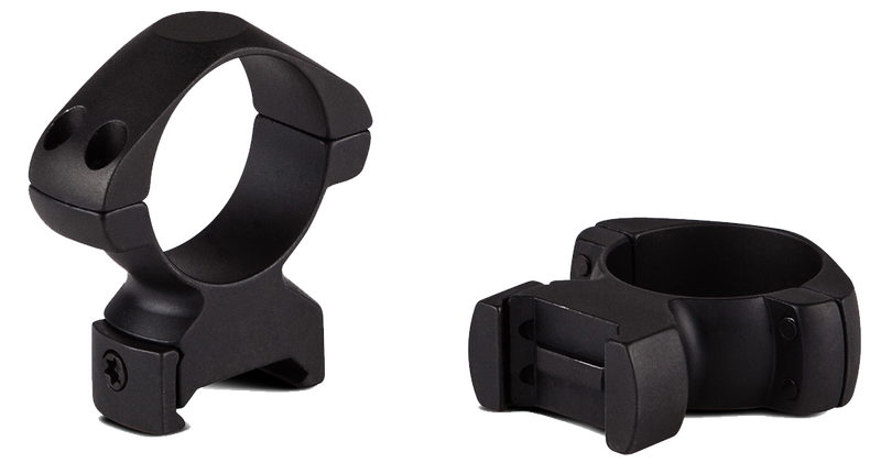 These are 2-piece steel mounting rings designed for 30mm scope tubes on Weaver/Picatinny rails. Features durable steel construction with heavy-duty Torx screws and a square recoil lug for secure mounting, with matte black finish.