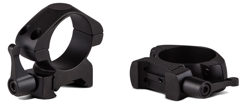 These Konus steel rings are designed for 30mm scope tubes and feature a quick release mechanism for tool-free mounting and removal. The medium height rings are finished in matte black and are compatible with Picatinny/Weaver rails, providing a 0 MOA mounting angle.