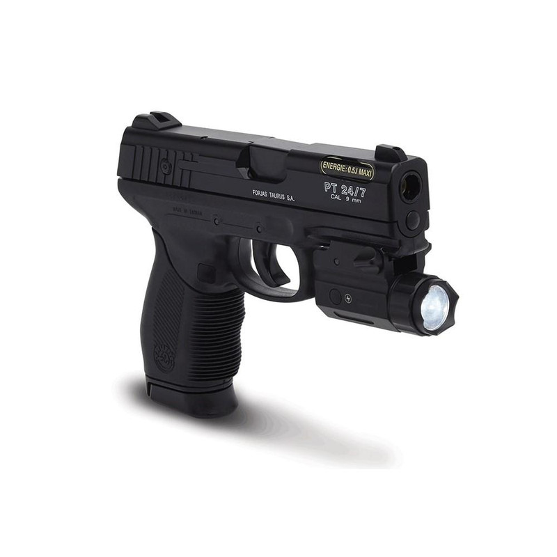 A compact tactical weapon light featuring 360 lumens of LED output with strobe functionality, designed to mount directly onto Weaver or Picatinny rails via quick-release system. Constructed entirely of metal with waterproof sealing and CR2 battery power, it is built to withstand recoil from high-powered firearms.