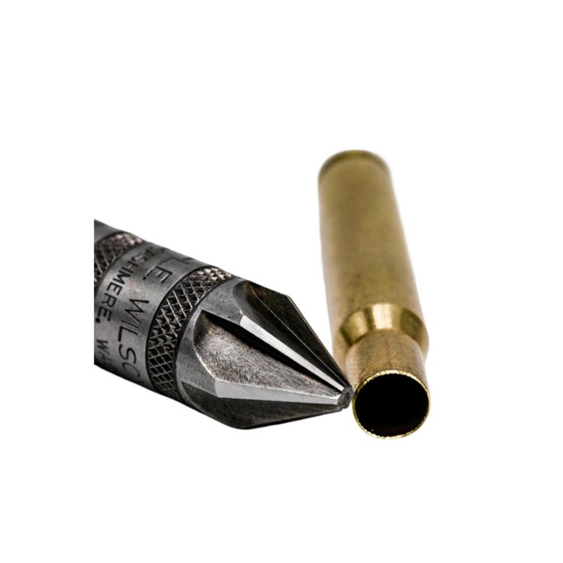 Double-ended handheld case mouth deburring tool with precision ground 45-degree flutes for chamfering inside and outside case mouths. Compatible with cartridge cases from .17 to .45 caliber and features optional power adapter capability. Designed for use after case trimming and neck turning to produce clean case mouth edges.