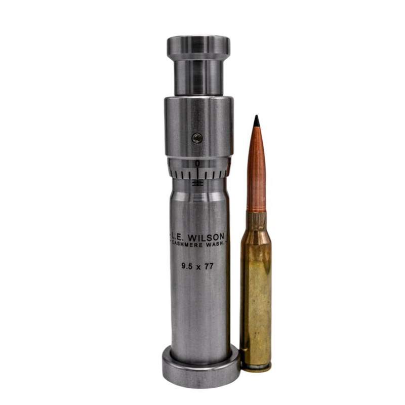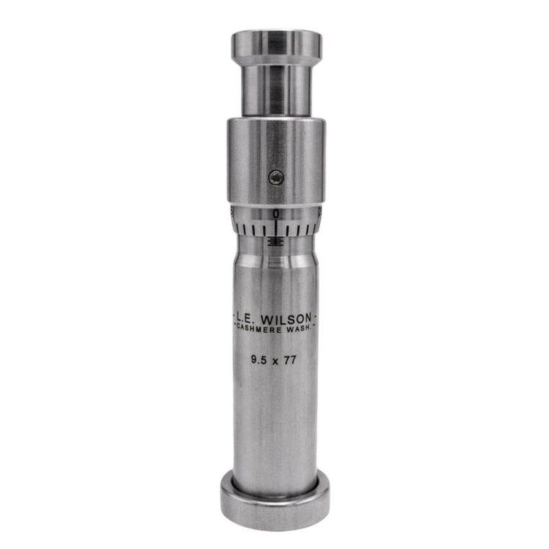 This L.E. Wilson stainless steel seater die features a built-in micrometer with 0.001" graduation markings for precise seating depth adjustment. The die includes 3/8"-24 TPI threads in the cap for major adjustments and laser-engraved markings. Designed for straight-line seating, it is suitable for reloading 9.5 x 77 caliber ammunition.