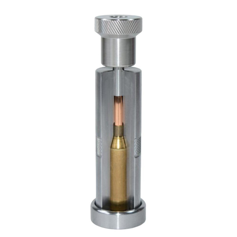 A chamber type bullet seater die that positively controls both bullet and cartridge case alignment, preferred by benchrest shooters for superior accuracy. The case and bullet are completely captured by the die prior to seating, with a close-fitting seating stem that pushes the bullet straight into the case. This design delivers more accuracy than conventional 7/8"-14 TPI bullet seating dies.