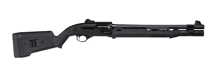 Semi-auto shotgun chambered in 12 gauge with 3" chamber and 18.5" barrel. Features black anodized aluminum receiver, Magpul polymer stock, modified Magpul Zhukov forend, Super Duty front sights, and ambidextrous controls. Weighs 9 lbs with cylinder and improved cylinder chokes included.