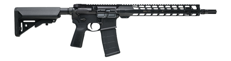 Semi-automatic rifle chambered in 223 Wylde with a 14.5" pinned barrel (16" OAL) and pinned/welded muzzle brake. Features anodized black finish, polymer grip, and comes with one 30-round magazine. Modern sporting rifle design suitable for tactical applications.