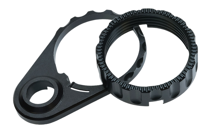 The LanTac RPS is an end plate and castle nut assembly that eliminates the need to stake the castle nut after installation. It features a ratcheted tooth and arm machined into the anti-rotation plate that registers with aggressive grip pattern grooves on the enhanced castle nut to retain it in place. The assembly also provides a QD sling attachment point directly below the buffer tube.