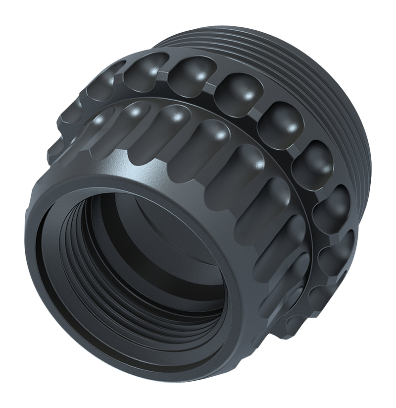 The LanTac ADC Plan B Hub is a muzzle device adapter with 1.375x24 thread pitch designed for suppressor compatibility. It features a QPQ black finish for corrosion resistance and allows for quick attachment and detachment of suppressors to compatible barrels.