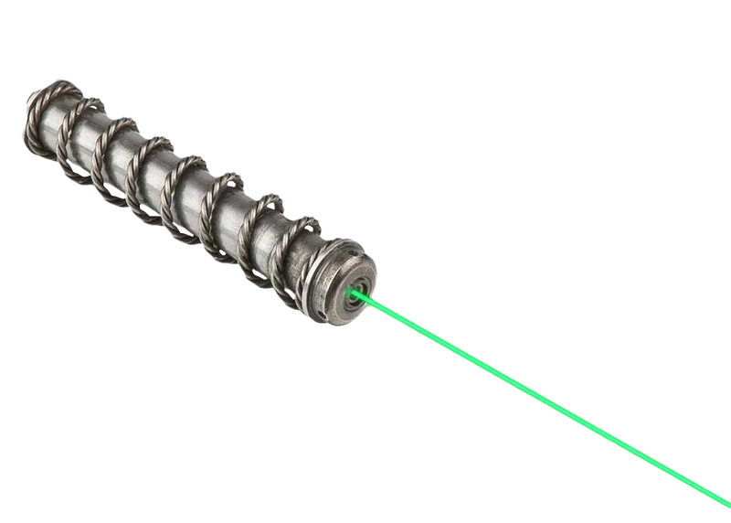This is a 5mW green laser sight (520nM wavelength) designed as a guide rod assembly for Glock 17, 17 MOS, and 34 Gen 5 pistols. The laser produces a 0.63" dot at 20 yards with an effective range of 50 meters and uses a 393 battery. It mounts directly into the guide rod for a low-profile installation without requiring adjustments.
