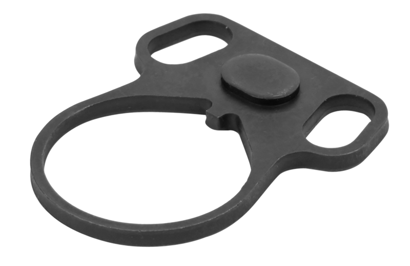 The LBE Unlimited ARAMEPL is an ambidextrous end plate designed for AR-15 rifles, constructed from steel with a black finish. This sling attachment hardware measures 4.0" in length and 2.8" in width, providing dual-side swivel stud mounting for left or right-handed shooters. Installation is straightforward on standard AR-15 buffer tube assemblies.