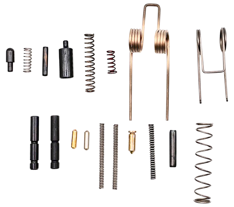 This AR Essentials Kit contains 18 critical internal parts for AR-platform rifles, including springs, pins, detents, and catches. Compatible with mil-spec AR-15 and AR-10 platforms, these parts are essential for lower receiver assembly and function. Installation requires basic gunsmithing knowledge and standard tools.
