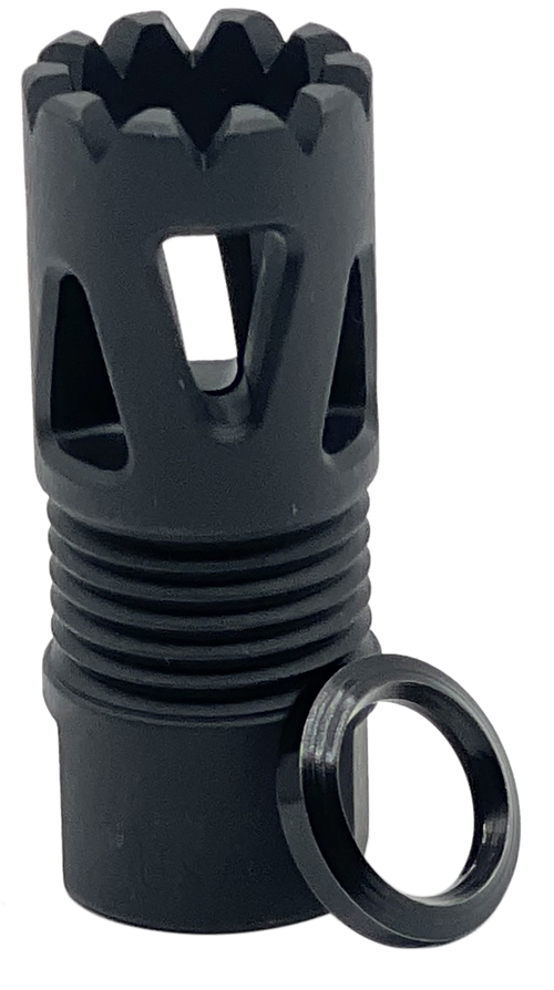 The LBE Unlimited REV Flash Hider is a muzzle device designed for 5.56mm/.223 caliber AR-15 platforms. It features a 1/2"-28 thread pitch with a crush washer for installation on standard AR-15 barrels. This flash hider reduces muzzle flash signature while maintaining a compact profile.