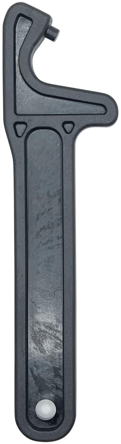 This floorplate removal tool is designed for use with Glock magazines and simplifies disassembly and cleaning. The black-finished tool provides a convenient way to remove magazine floorplates without damaging components. Dimensions are approximately 8.6" length x 5.9" width x 0.4" height.