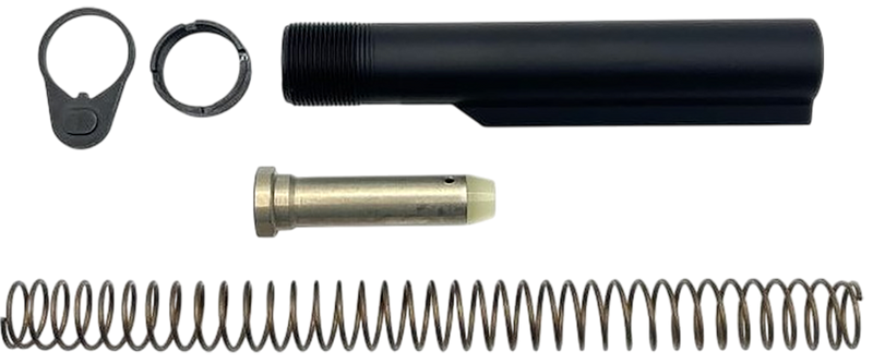Complete AR-15 buffer tube assembly kit including 6-position mil-spec diameter buffer tube, carbine length recoil spring, end plate, castle nut, and H2 heavy recoil buffer. This drop-in kit provides all components necessary for buffer tube installation on mil-spec AR-platform receivers. Designed for reliable operation and easy assembly.