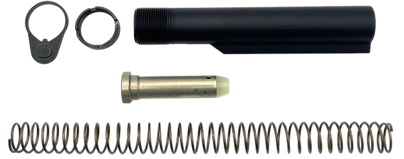 Complete AR-15 buffer tube assembly including 6-position mil-spec diameter buffer tube, carbine length recoil spring, end plate, castle nut, and H3 heavy recoil buffer. Designed for mil-spec AR platform rifles with straightforward installation requiring standard AR armorer tools.