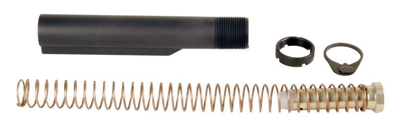 Complete mil-spec buffer tube assembly for AR-15 platforms, including buffer tube, recoil spring, castle nut, receiver end plate, and recoil buffer. Designed for standard mil-spec AR-15 receivers with a 6-position collapsible design. Installation is straightforward on compatible AR-15 lower receivers.