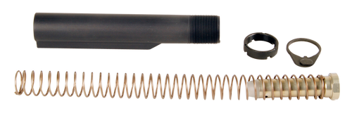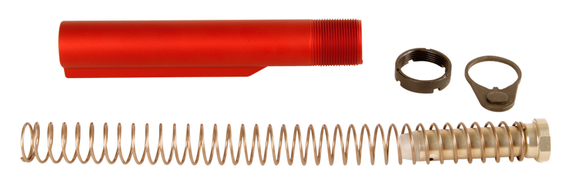 Complete mil-spec buffer tube assembly for AR-15 platform rifles, including buffer tube, recoil spring, castle nut, receiver end plate, and recoil buffer. This 6-position kit features a red finish and is designed for easy installation on standard AR-15 lower receivers. All necessary components are included for a complete buffer system assembly.