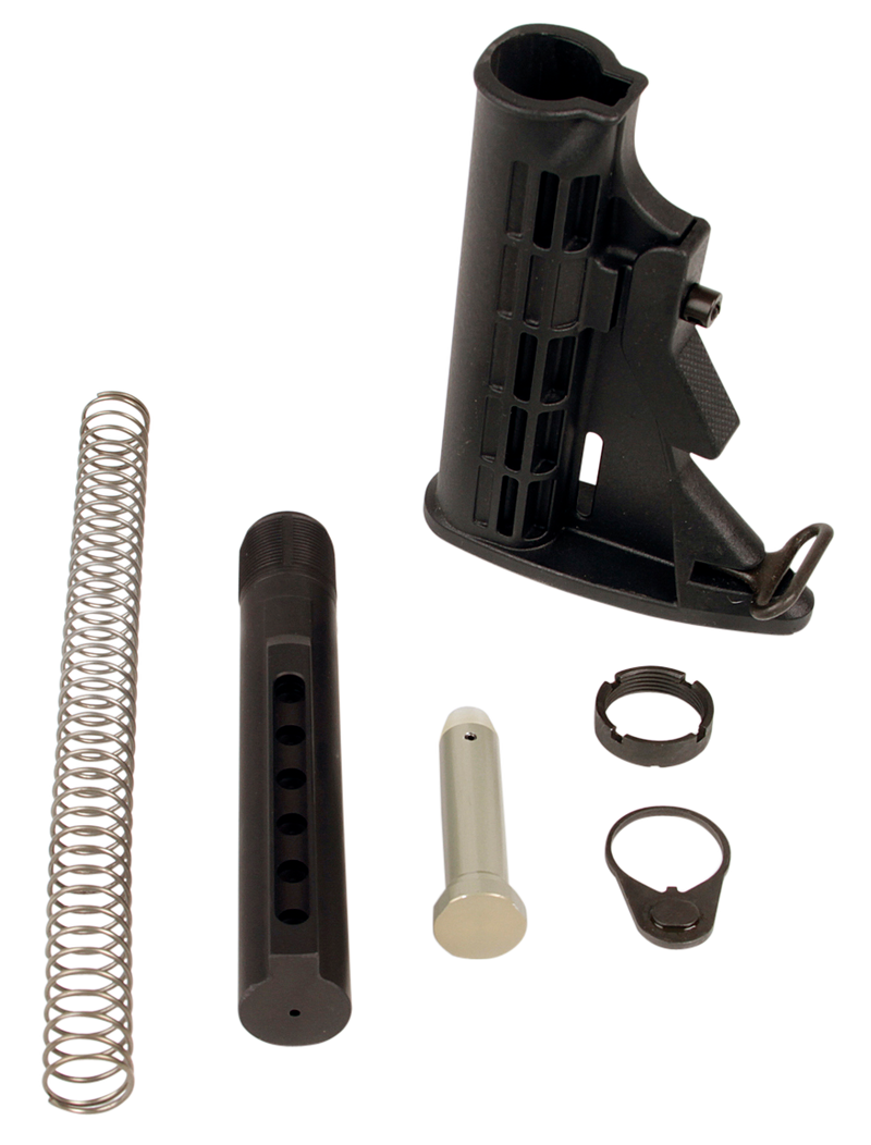 Complete mil-spec stock assembly kit for AR-15 and M4 platforms, includes stock, buffer tube, castle nut, and lock plate. Features 6-position adjustable synthetic stock in black finish for customizable length of pull.