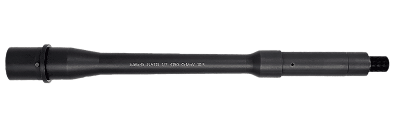Match Grade barrel chambered in 5.56 NATO with a 10.5" length and 1:7" twist rate, constructed from nitride steel for enhanced durability and corrosion resistance. Features a threaded muzzle end for muzzle device installation. Compatible with AR-15 platform rifles and designed for precision shooting applications.