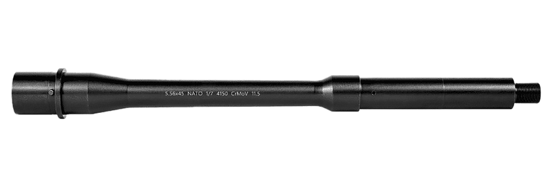 This is a match-grade barrel chambered in 5.56 NATO with an 11.5" length and 1:7" twist rate, designed for AR-15 platform rifles. The barrel features a threaded muzzle end for attachment of suppressors or other muzzle devices. Constructed from steel with precision rifling for enhanced accuracy.