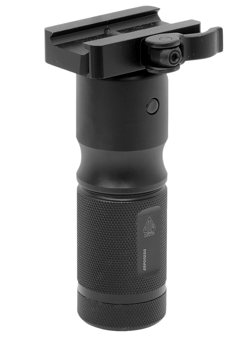 Leapers UTG vertical foregrip with quick detach lever lock mount designed for Picatinny rails. Features a low-profile foldable design constructed from combat-quality aluminum in matte black finish. Dimensions: 7.8" length, 4.70" height, 3.3" width.
