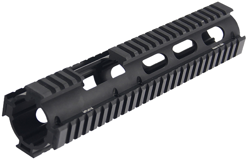 Drop-in quad rail handguard designed for AR-15 rifles in carbine length with front extension. Constructed from aluminum with a matte black finish, featuring four picatinny rails for accessory mounting. Measures 17.3" in length with 12.2" width and 2.4" height.
