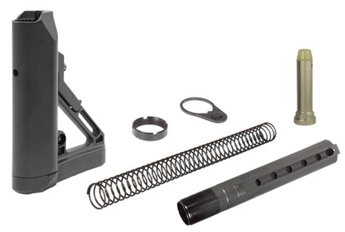 Mil-spec collapsible stock kit designed for AR-15 platforms, constructed from impact-resistant polymer with a precision-machined aircraft-grade aluminum extension tube. Features a rubberized butt pad, FDE Cerakote finish for corrosion resistance, and rolled threads for secure fit. Made in the USA with tight tolerance controls for dependable performance.