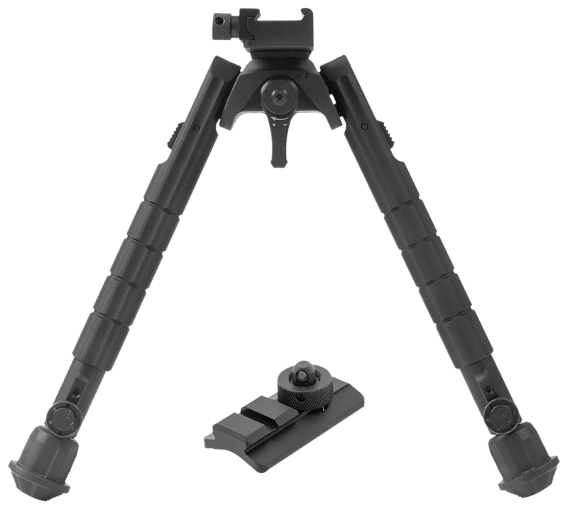 The Leapers UTG Recon 360 TL is an aluminum bipod with 8-12" center height adjustment and black anodized finish. It features 360-degree panning capability with 15-degree forward, rearward, left, and right tilt, all with user-adjustable tension via a centrally located throw lever. The bipod includes rubber feet and attaches via Picatinny rail or swivel stud.