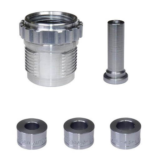 The Lee Bulge Buster Kit removes bulge rings from handgun brass that standard dies cannot reach due to shellholder constraints. The kit includes an extension sleeve, push-through punch, and catch container for efficient case processing. Compatible with carbide crimp dies and designed for .380 ACP, 10mm, .40 S&W, .41 AE, .45 ACP, .45 GAP, and .45 Winchester calibers.