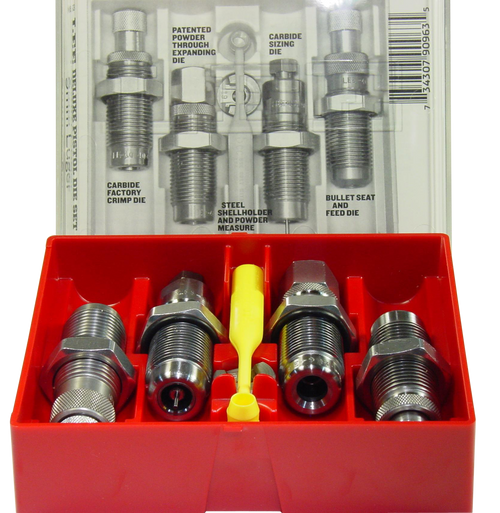 This Lee Precision deluxe 4-die reloading set for 45 Colt includes carbide dies that separate seating and crimping operations for simplified adjustment. The set features a Lee Factory Crimp Die that post-sizes cases to ensure proper chambering. Includes shell holder and measures 5.8" x 4.7" x 1.4".