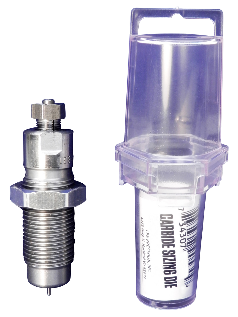 Full-length carbide sizing die designed for 9mm Luger reloading. Features a solid carbide insert with special contour to prevent objectionable belt marks on cases. Compatible with Lee reloading equipment and presses.