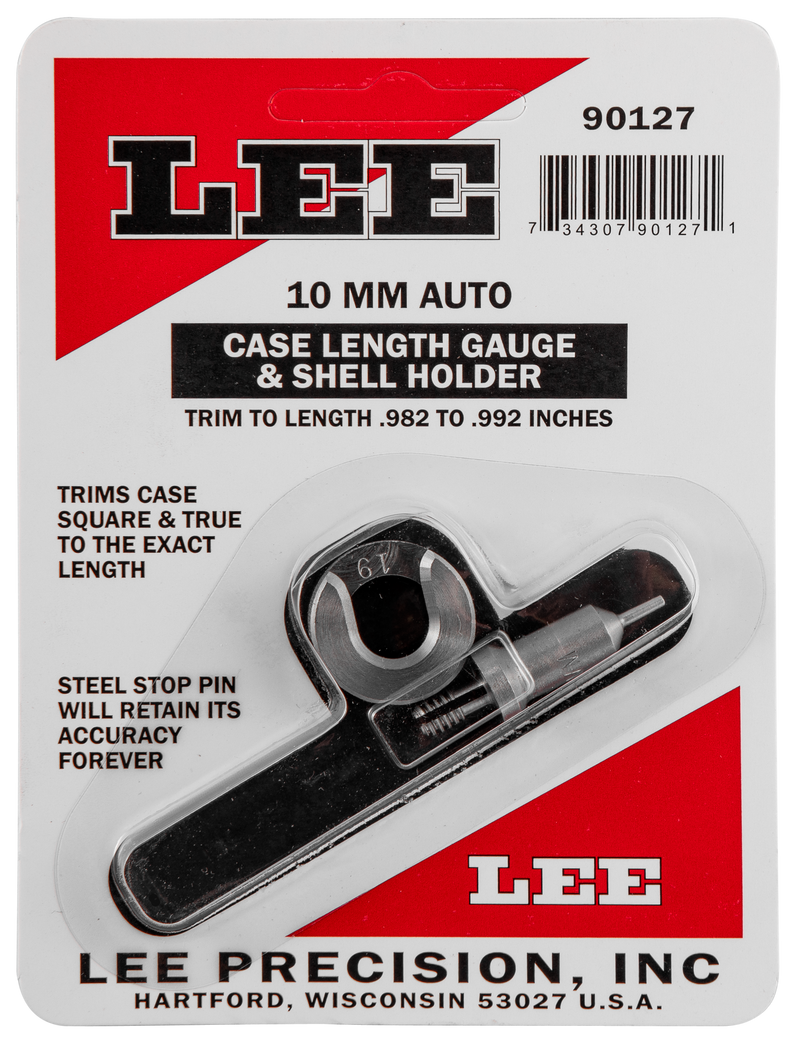 This hardened steel case length gauge is precision-crafted to SAAMI specifications and designed for the 10mm Auto cartridge. It includes a shell holder to firmly secure cases during trimming operations and provides a fast, accurate method for trimming brass cases while squaring their mouths. The tool is built for durability and repeated reloading use.