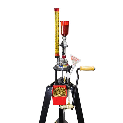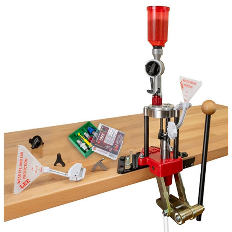 A single-stage turret reloading press featuring solid steel linkage and a long stroke capable of handling rifle cases over three inches long with automatic indexing. The press includes a hardwood-gripped lever and sturdy iron base, and comes with a 9mm Luger 3-die set. California Prop 65 warning applies.