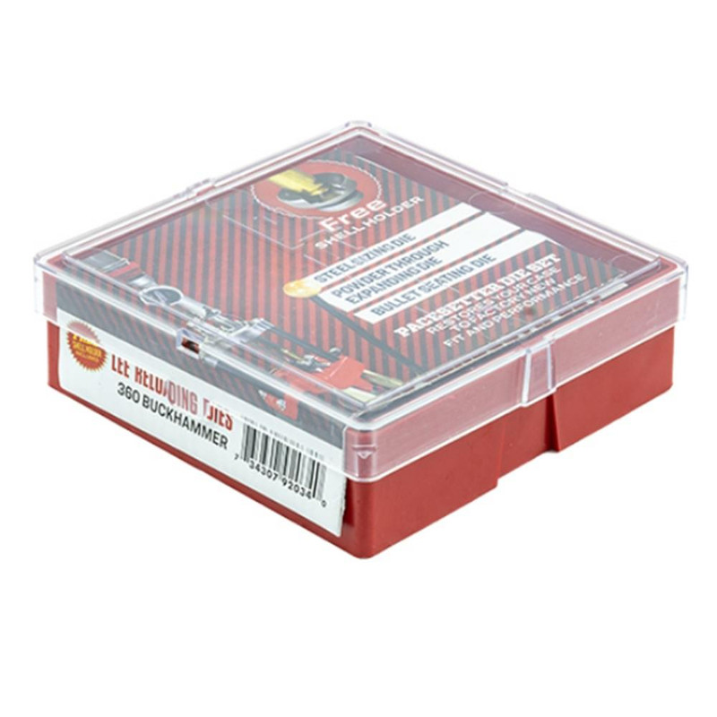 This Lee Pacesetter 3-die steel set for .360 Buckhammer includes a full length sizing die, powder through expanding die, and bullet seating die with universal shell holder. The set requires Lee Resizing Lubricant and a separately sold collet-style factory crimp die for complete reloading. Load data should be obtained from powder manufacturers as it is not included.