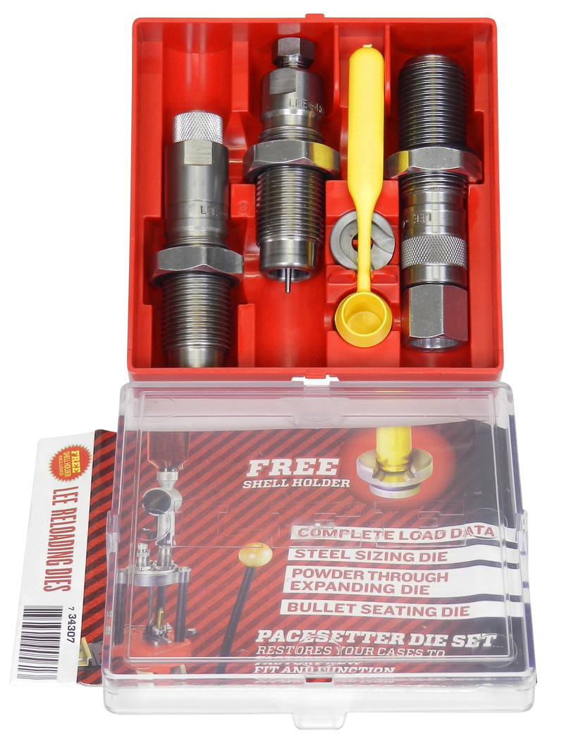 This Lee Steel 3-Die Set for .50 Action Express includes a full length sizing die, powder through expanding die, and bullet seating die, plus a universal shell holder. Steel dies require the use of case lubricant and offer a moderately priced option for handgun reloading. The set is designed for pistol ammunition reloading.