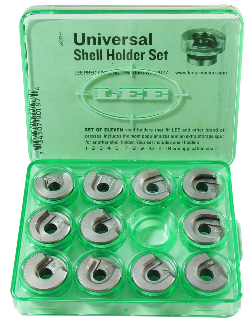 This Lee Universal Shell Holder Set includes 11 hardened steel shell holders (#1, #2, #3, #4, #5, #7, #8, #9, #10, #11, and #19) designed for reloading ammunition across various pistol and rifle calibers. The set is compatible with most single-stage reloading presses and comes in a green storage box for organization and protection. Made from hardened steel, these holders provide reliable case holding for years of reloading service.