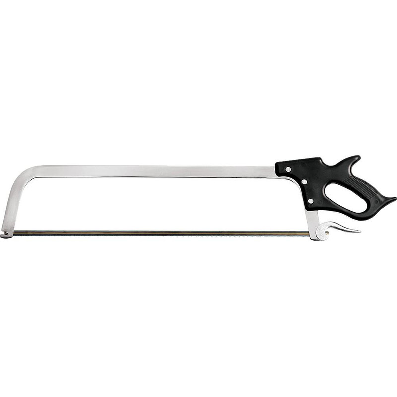 Professional-grade meat saw featuring a heavy nickel-plated frame and large blade tightening lever for easy blade changes. Comes standard with a 1/2" blade and accepts optional 1" replacement blades. Designed for game processing and meat preparation tasks.