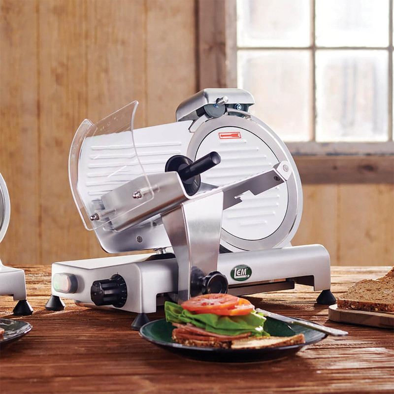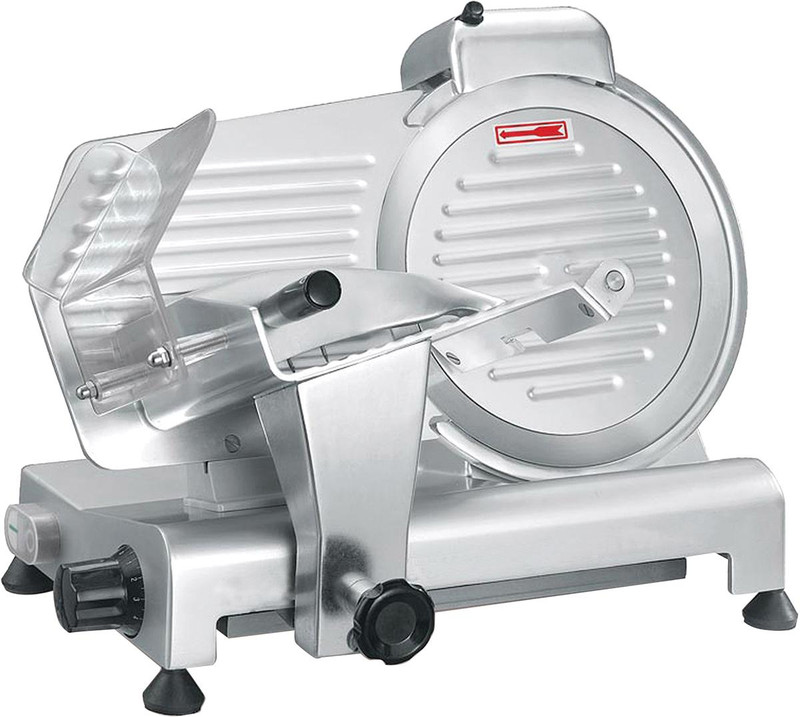 Heavy-duty commercial grade meat slicer with a finely honed blade that resists dulling through frequent use. Features a sliding carriage and food holder arm for consistent, precise cuts ranging from 1mm to 10mm thickness. Includes a sharpener and graduated knob adjustment for versatile slicing of boneless meats.