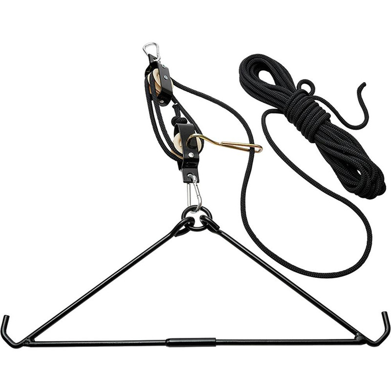 This pulley-based lifting system enables single-person operation with a 500-pound weight capacity and automatic self-locking mechanism. The kit includes a 22" lightweight gambrel and rot-resistant polypropylene rope, and collapses for easy transport in a hunting bag. Designed to support game by the hind legs for enhanced draining and cooling during processing.