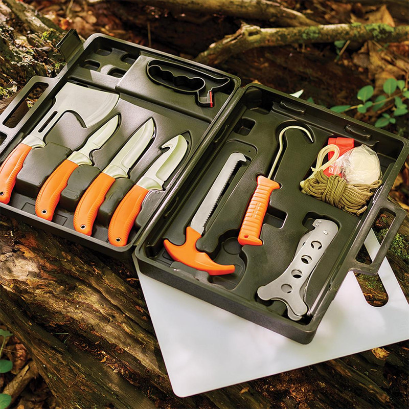 Complete field dressing kit featuring multiple heat-treated stainless steel knives and tools for piercing, boning, skinning, sawing, and detail work on game. Full-tang construction provides excellent edge retention and corrosion resistance, with brightly colored handles for visibility in the field.