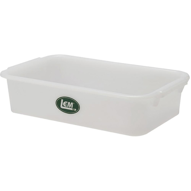 Food-grade high-density polyethylene storage container measuring 13" L x 8" W x 3" H with a 7 lb. capacity. Designed for holding meat cuts, mixing seasonings, and storing processed game during butchering and food preparation. Compatible with LEM Products Mini Meat Lug Lid for stackable refrigerator and freezer storage.