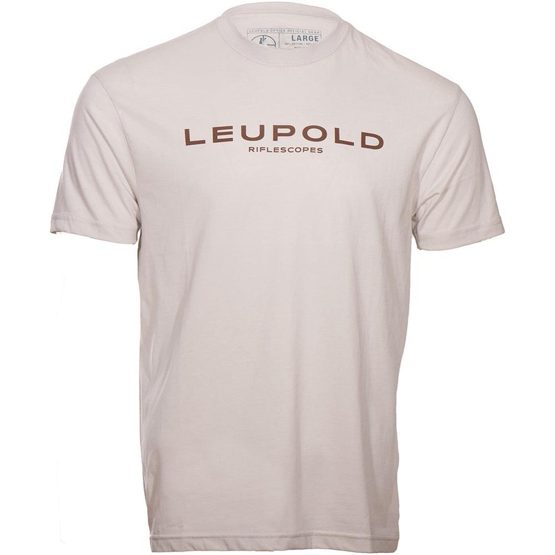Cotton-polyester blend short sleeve shirt featuring Leupold Riflescopes branding. Side seams and reinforced shoulders provide durability, while breathable fabric offers comfort for outdoor wear. Available in medium size, sand/tan color.