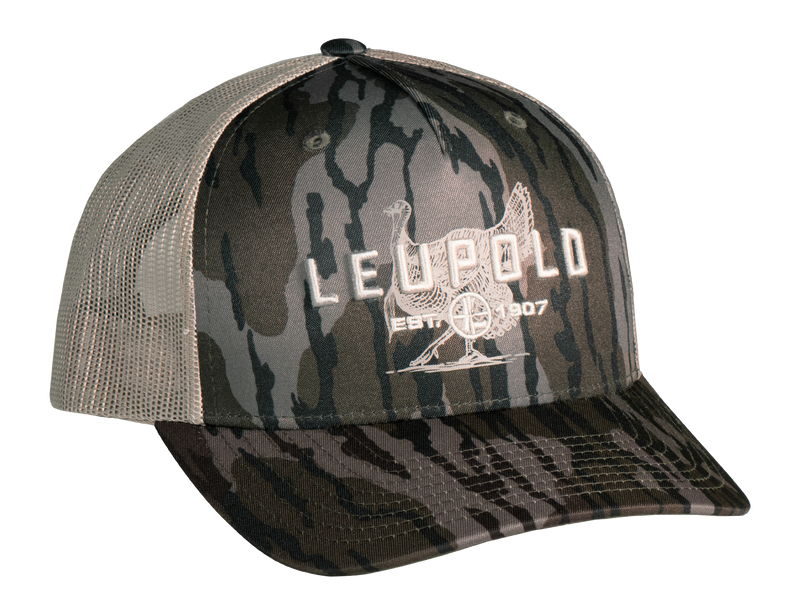 Leupold Turkey Trucker cap in Mossy Oak Bottomland/Khaki camouflage pattern designed for hunting applications. One size fits most with structured trucker-style construction. California Prop 65 compliant.