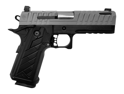 The LFA Apollo 11 V2 is a 9mm semi-auto pistol with a 4.15" barrel and 18+1 round capacity. Features include an optics-ready slide, front night sights, billet trigger bow, and 6061 aluminum grip frame with Bronze Cerakote finish. Weighs 32.61 oz and includes a soft case.