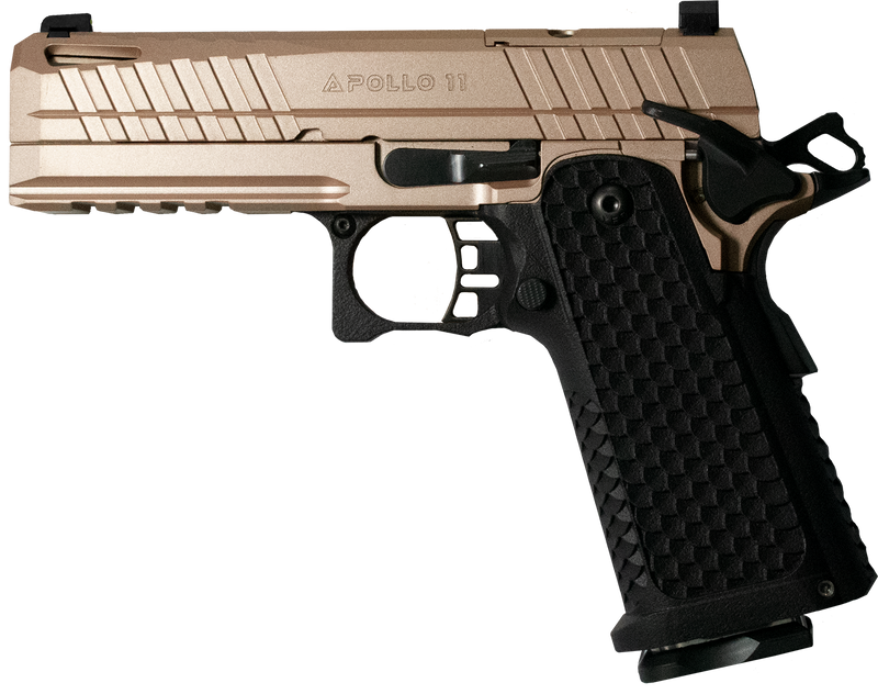 The Apollo 11 Compact is a 9mm Luger semi-auto pistol with a 4.15-inch barrel and optic-ready slide featuring serrated edges, designed for concealed carry. It features an ambidextrous safety, textured grips, and a double-stack magazine capacity of 17+1 rounds. Dimensions are 7.56"L x 4.9"H x 1.06"W.