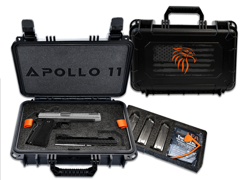 The Live Free Armory Apollo 11 FS is a 9mm Luger striker-fired semi-auto pistol with a 4.9" ported barrel and 17+1 capacity. The slide features an optic cut and serrated top for mounting red dots, along with a ported barrel for reduced recoil. It includes ambidextrous grip safety and aggressive texture grips for secure handling.