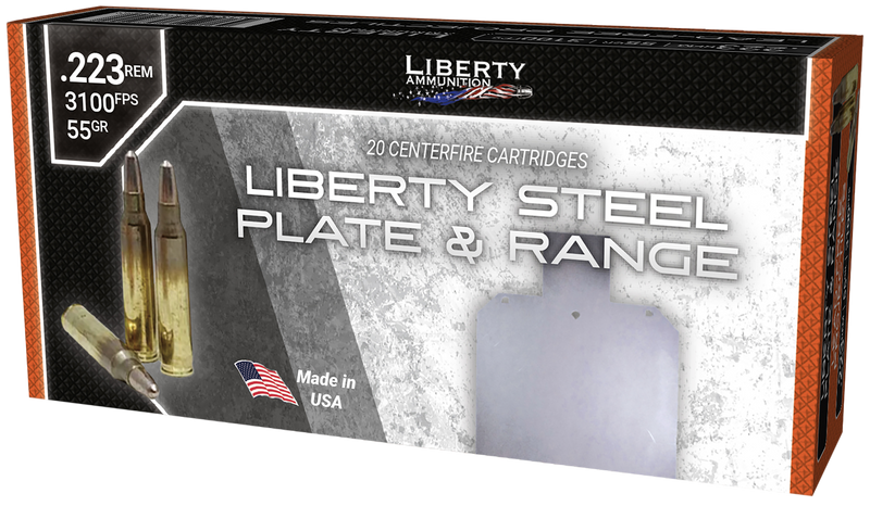 Liberty Ammunition Steel Plate & Range .223 Rem ammunition features 55 grain lead-free SinterFire frangible projectiles designed for indoor and outdoor training on steel targets. Delivers 3100 fps muzzle velocity and 1173 ft-lbs of energy with 1 MOA accuracy at 300 yards. Sold in boxes of 20 rounds, 50 boxes per case.
