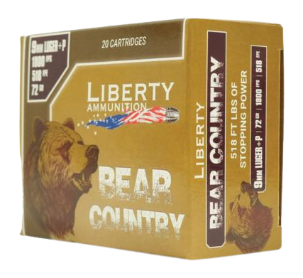 Liberty Bear Country 9mm Luger +P ammunition features a 72-grain solid bullet loaded to 1850 fps, delivering 596 ft-lbs of kinetic energy. This lead-free, brass-cased ammunition is packaged 20 rounds per box and designed for reliable performance in +P-rated handguns.