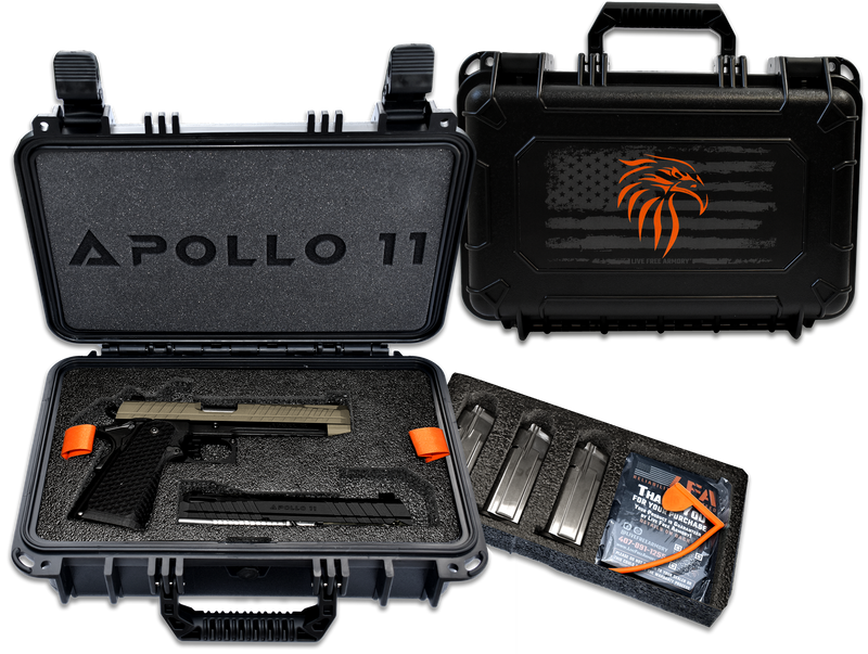 The Live Free Armory Apollo 11 is a 9mm Luger striker-fired semi-automatic pistol with a 4.15" barrel and 17+1 round capacity. It features a heat-treated 416 stainless steel slide with Flat Dark Earth Cerakote finish, optic-ready serrated slide, and black textured polymer grips. Dimensions are 8.0" length x 5.3" height x 10.5" width.